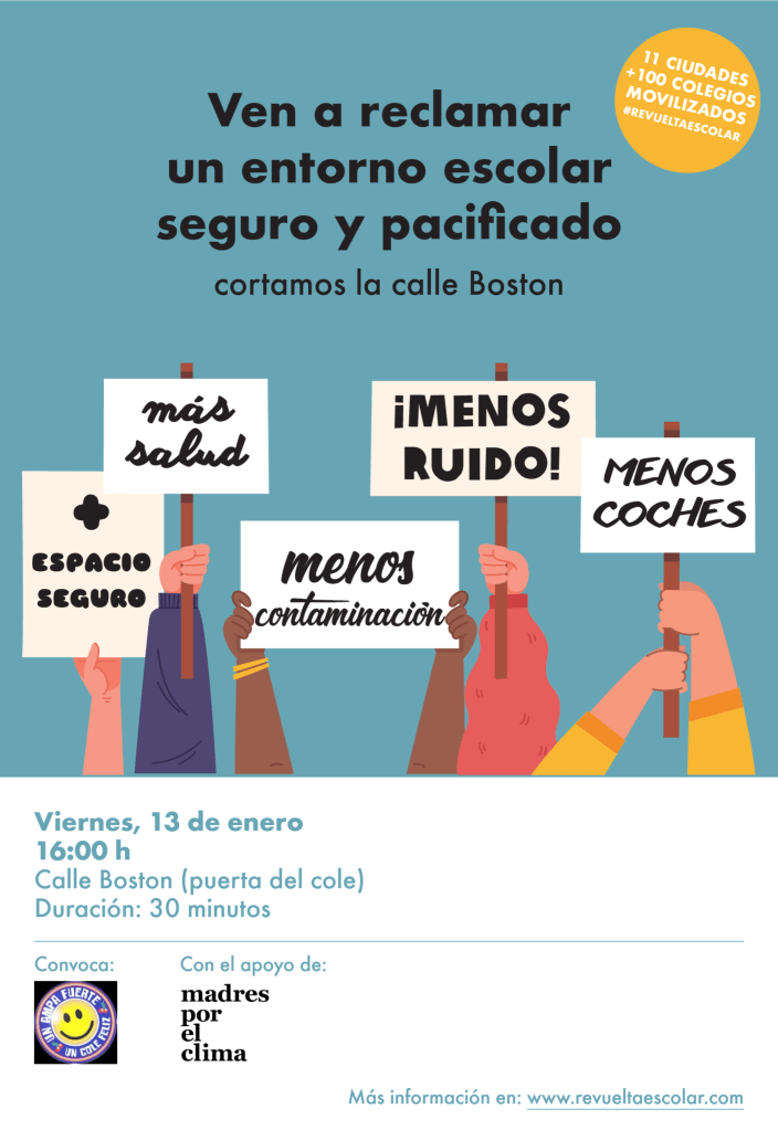 Queremos que el entorno del cole sea más seguro y saludable para l@s peques, con menos contaminación y menos ruido. Además, nos gustaría que el acceso al cole por la calle Boston fuese peatonal y contase con más medidas de seguridad, tal y como venimos solicitando desde hace tiempo. Por eso, este viernes queremos reivindicar la protección especial que nuestr@s hij@s requieren frente a la priorización de la circulación y el estacionamiento de vehículos.