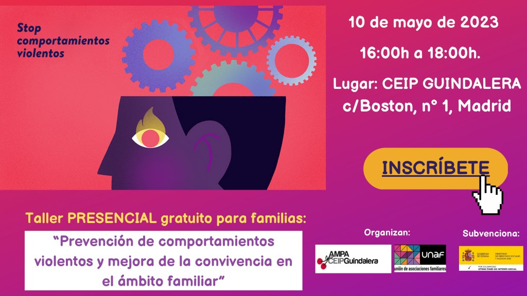 Tras la buena acogida del taller de la semana pasada, os invitamos a una nueva sesión formativa para familias el próximo 10 de mayo, de 16 a 18h. El taller estará dirigido por la psicóloga Susana Piedra, de UNAF, y bajo el nombre Stop comportamientos violentos, se centrará en: