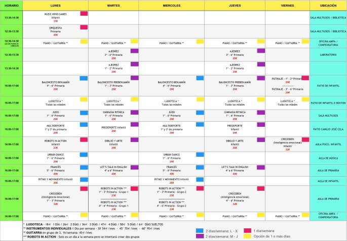A continuación podéis ver el cuadrante de las actividades que se ofrecerán en el centro a través del AMPA: