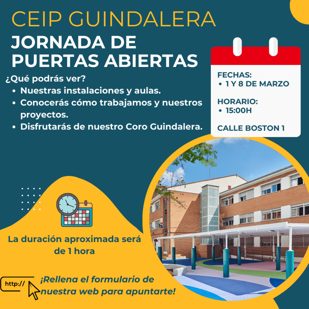 Jornada de puertas abiertas 29 febrero 2024 por AmpaGuinda, posted in AGENDA Si conocéis a familias interesadas en nuestro cole, os recordamos que los dos próximos viernes 1 y 8 de marzo habrá Jornadas de Puertas Abiertas a las 15h. (acceso por la calle Boston). ¡Que corra la voz! Email a link to a friend (Se abre en una ventana nueva) Correo electrónico Compartir en WhatsApp (Se abre en una ventana nueva) WhatsApp Compartir en X (Se abre en una ventana nueva) X