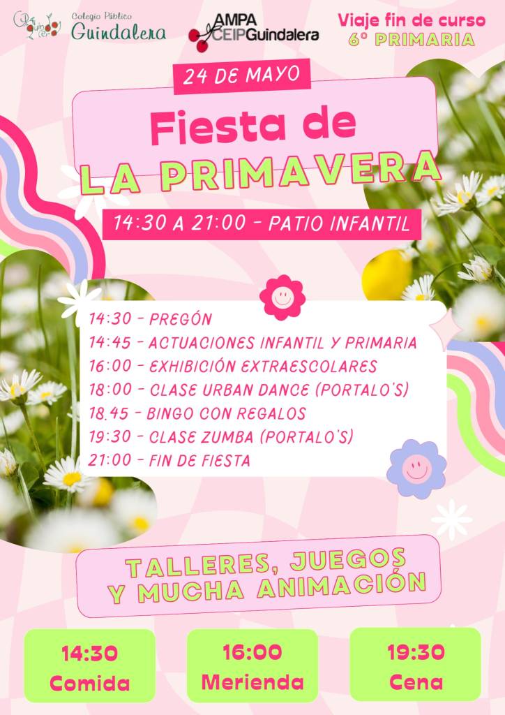 Llega uno de los eventos más esperados por todas las familias del colegio: la Fiesta de la Primavera 2024. Este año se celebra el viernes 24 de mayo (siempre que el tiempo lo permita, si llueve se trasladará al 31 de mayo). Esta fiesta se organiza conjuntamente entre las familias de 6º de Primaria, el AMPA y el Centro.