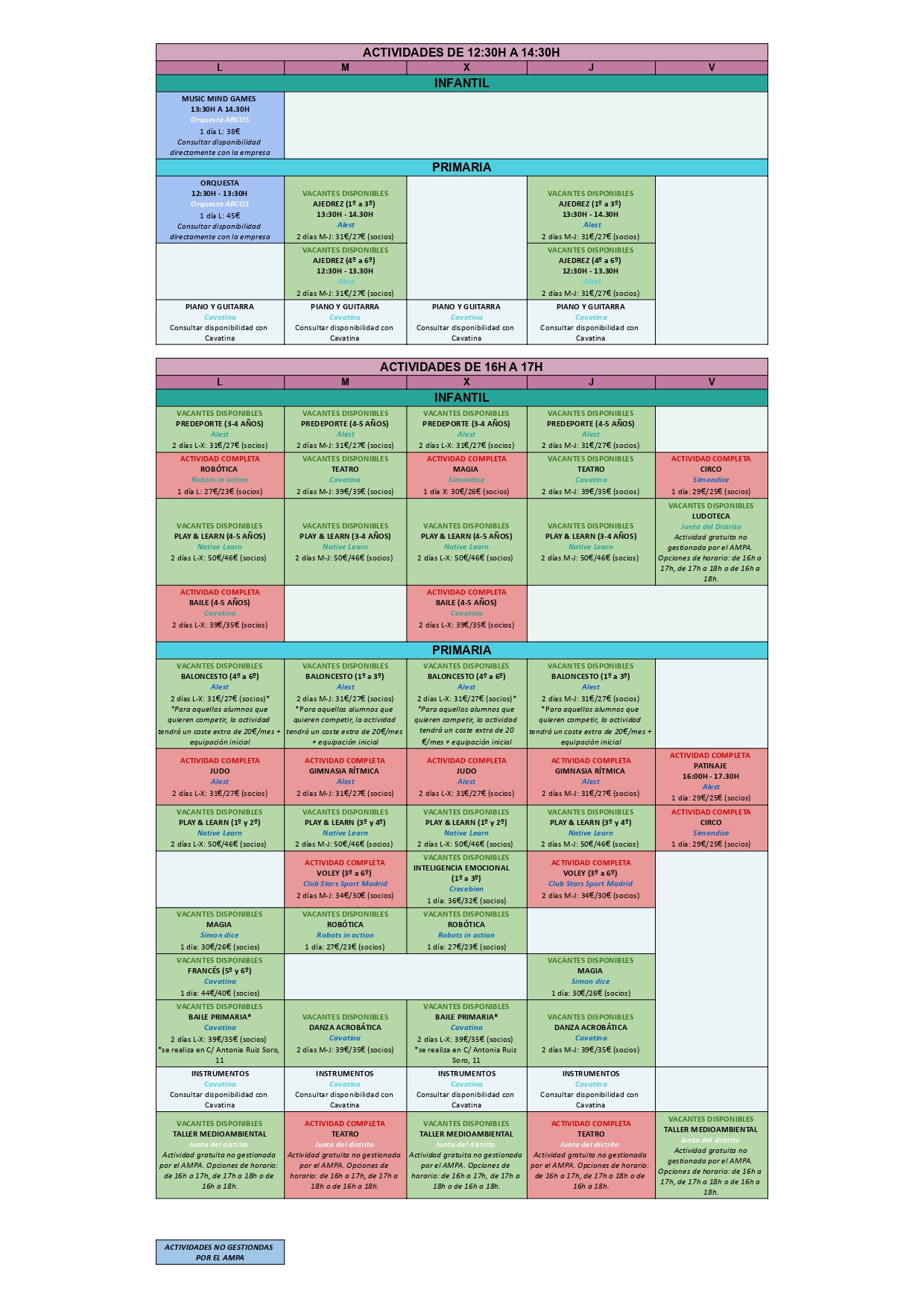 Una vez finalizado el plazo de inscripción y el sorteo de plazas para las actividades más demandadas, os enviamos el cuadro actualizado con las actividades que aún tienen plazas disponibles (en verde con el número de vacantes) y las que ya están completas (en rojo).