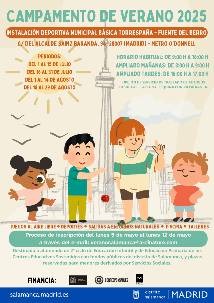 Este campamento es gratuito y se realiza en las instalaciones deportivas de Torrespaña-Fuente del Berro (C/ del Alcalde Sainz Baranda, 94 – metro O’Donnell), aunque existe la opción de trasladado en autobús desde el colegio. Puedes solicitar hasta 4 periodos (del 1 al 15 de julio, del 16 al 31 de julio, del 1 al 14 de agosto y del 18 al 29 de agosto). El plazo de inscripción comienza el lunes 5 hasta el lunes 12 de mayo enviando el formulario al correo: veranosalamanca@arcinature.com. Tienes más información aquí.