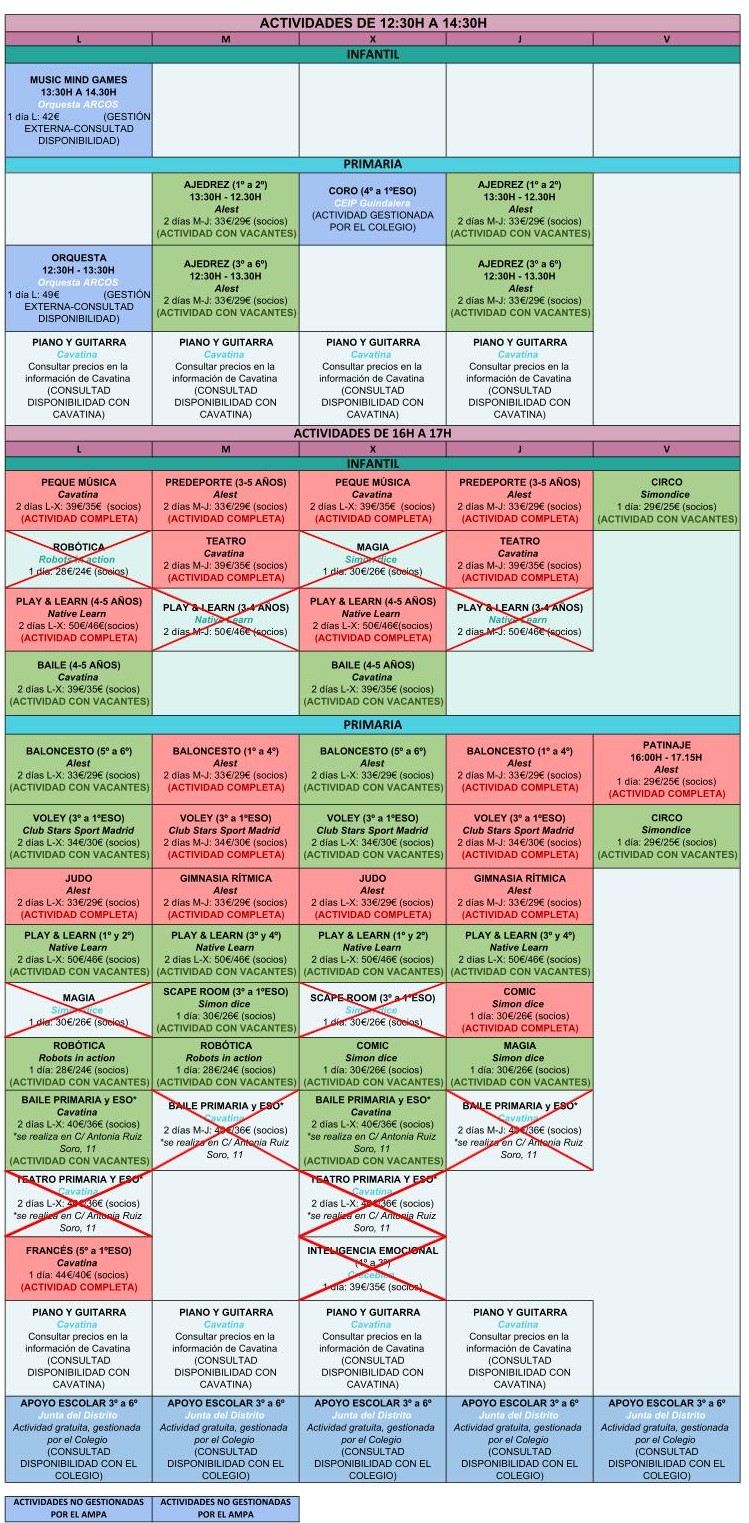 | Peque Música (Infantil) Teatro (Infantil) Baile (Infantil) Guitarra Piano Otros instrumentos (fuera del colegio) Francés (Primaria/ESO) | Información Empresa: Cavatina Contacto Mercedes: 648725981 musica@escuelacavatina.com |