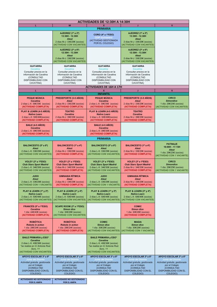 | Peque Música (Infantil) Teatro (Infantil) Baile (Infantil) Guitarra Piano Otros instrumentos (fuera del colegio) Francés (Primaria/ESO) | Información Empresa: Cavatina Contacto Mercedes: 648725981 musica@escuelacavatina.com |